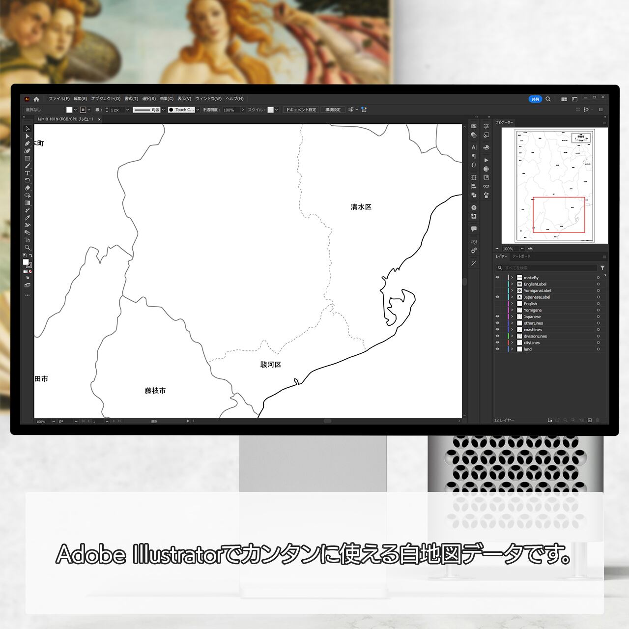 静岡県静岡市と静岡市の各3区(葵区、駿河区、清水区)の合計4地域がセットになっているイラストレータ白地図データ集です。