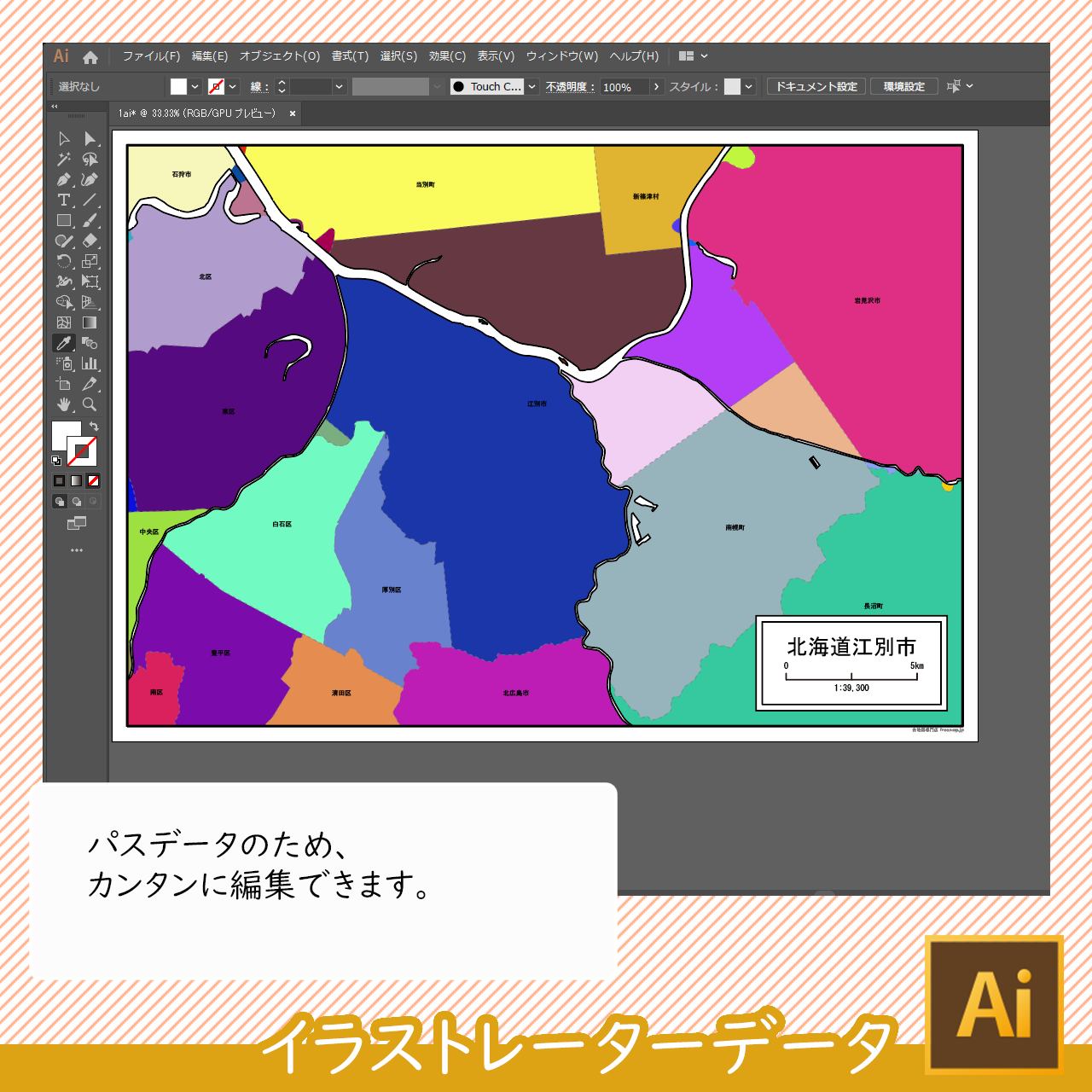 Illustratorで自由に再編集可能な白地図です。書籍・出版物・レポート・ウェブサイト・スマホアプリ・TV等の映像作品など、様々な用途にご利用いただけます。